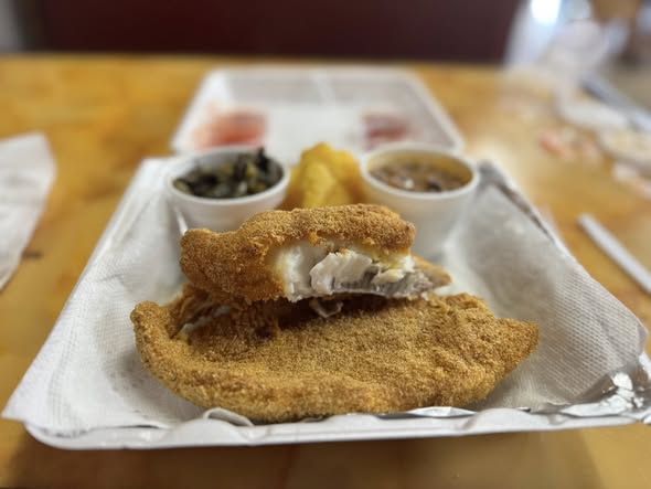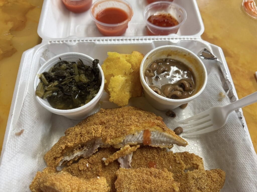 I absolutely LOVE the catfish fillets with the hot sauce. That hot sauce is so good and the fillets are pretty meaty in my opinion. They are also not overly seasoned — a light seasoning is what I prefer and that’s what you get here. For my sides I ordered the Black Eyed Peas and the Greens. And the meal comes with corn bread. All of the sides were good, but the black eyed peas are incredible.