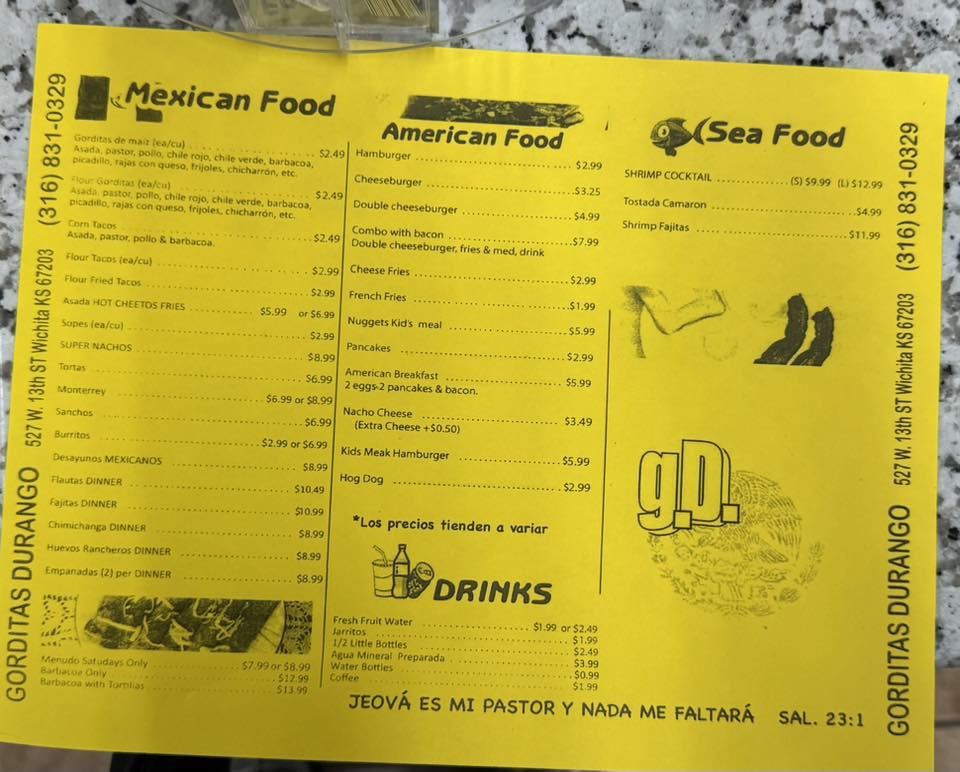 I went to Gorditas Durango in Wichita (just west of N. Waco on 13th) at 527 W. 13th St. N. And these are some gosh darn good Gorditas.